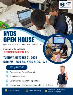 Our Fall Open House had to be cancelled last minute due to an emergency but was rescheduled to Tuesday, October 21, 2025 at 5:30 pm. If you know anyone interested in attending NYOS or who may want to come by for a tour and Q&A with admin, please invite them.
