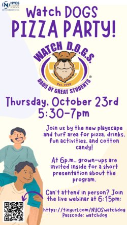 You’re invited to our 1st Annual Watch DOGS Pizza Night on Thursday, October 23rd, at 5:30 PM in the courtyard area by the new playscape and turf space!