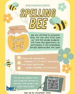 Families will have the opportunity to sign up if they would like their child to participate. Grade-level spelling bees will take place on December 2nd, 3rd, and 4th. The top four spellers from each grade will advance to the School Spelling Bee, scheduled for Monday, December 9th at 6:00 p.m.
