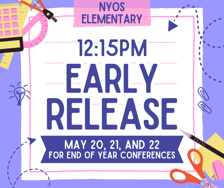 The board recently approved changes to the school calendar to accommodate end-of-year conferences. Our elementary students will have early release on Wednesday, May 20, Thursday, May 21, and Friday, May 22. Please plan accordingly for pick-up on these days!