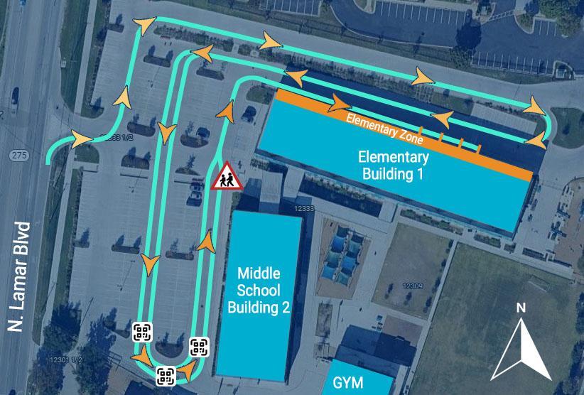 • Once exiting our campus, cars must take a RIGHT TURN ONLY at N Lamar Blvd.